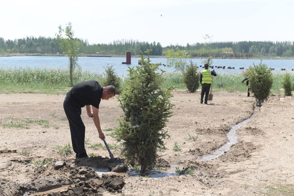 ?2024年4月23日,在地處黃河“幾字彎”的內(nèi)蒙古巴彥淖爾市臨河區(qū),新華林場職工給新栽種的樹木澆水。新華社記者 李云平 攝