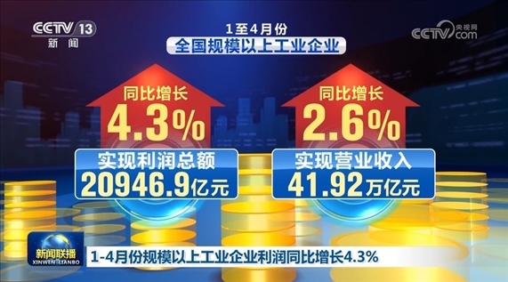 央視網(wǎng)消息(新聞聯(lián)播):記者今天(5月27日)從國(guó)家統(tǒng)計(jì)局發(fā)布的最新數(shù)據(jù)了解到,1—4月份,全國(guó)規(guī)模以上工業(yè)企業(yè)實(shí)現(xiàn)利潤(rùn)總額20946.9億元,同比增長(zhǎng)4.3%;實(shí)現(xiàn)營(yíng)業(yè)收入41.92萬(wàn)億元,同比增長(zhǎng)2.6%。企業(yè)利潤(rùn)繼續(xù)保持平穩(wěn)增長(zhǎng),企業(yè)營(yíng)收持續(xù)改善。