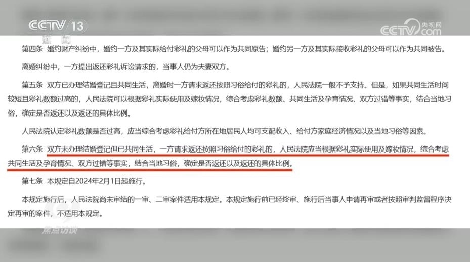 陜西省韓城市人民法院芝陽人民法庭庭長王春妮:“我們跟原告充分釋法明理,讓他知道咱們國家有新的規(guī)定,對他經過反復做工作,他也降低了自己的心理預期。被告這邊認為我跟你在一起共同生活了,我也是實心想跟你過日子,但是因為沒有領證,而且我還跟你共同生育了一個孩子,你現在要求我給你返還彩禮,我就不愿意返還,心里有抵抗情緒?!?/p>