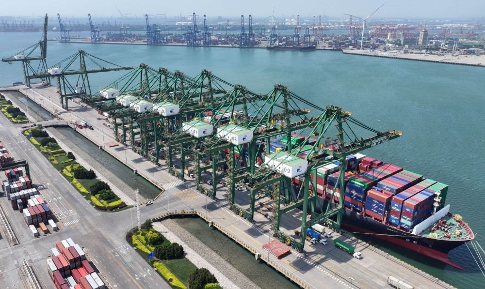 貨輪靠泊在天津港太平洋國(guó)際集裝箱碼頭裝載貨物(無(wú)人機(jī)照片,5月29日攝)。新華社記者 趙子碩 攝