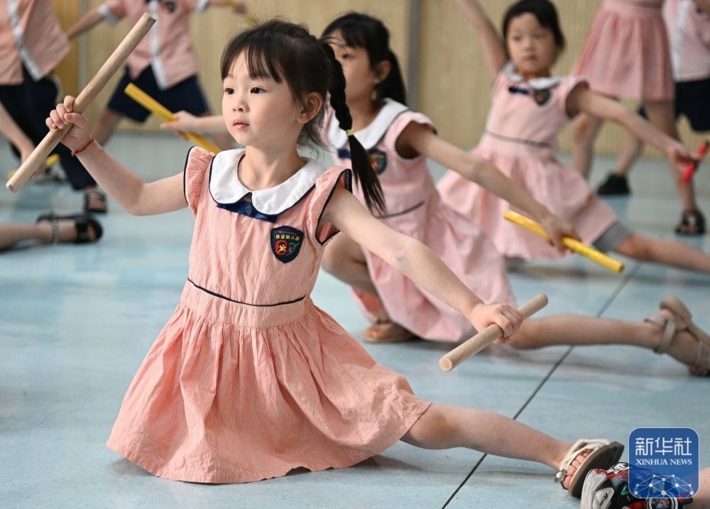 5月29日,在汕頭市貴嶼鎮(zhèn)北林保嬰幼兒園,莊恩琪練習跳英歌舞。