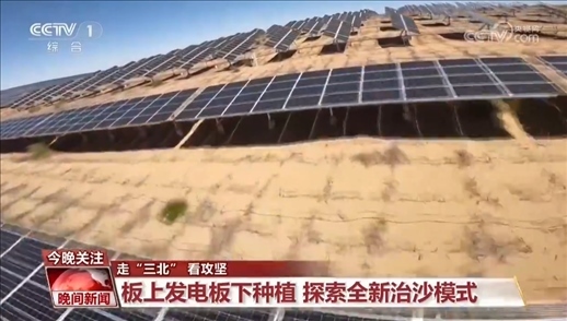 總臺(tái)記者 李欣蔓:治沙的腳步不但沒有停,還在不斷探索新的治沙模式?,F(xiàn)在我們看到的是鄂爾多斯一個(gè)已經(jīng)建好、并網(wǎng)發(fā)電的光伏項(xiàng)目,板上發(fā)電,板下種植,一個(gè)空間全方位利用。三重防線,構(gòu)建起了全新的生態(tài)治沙模式。有一個(gè)數(shù)據(jù)值得我們關(guān)注,這里的光伏項(xiàng)目占地39萬畝,與此同時(shí),生態(tài)治理面積也將規(guī)劃完成39萬畝。在國(guó)家推進(jìn)光伏治沙項(xiàng)目開發(fā)建設(shè)的進(jìn)程中,我們看到越來越多的企業(yè)參與其中,在發(fā)展新能源產(chǎn)業(yè)的同時(shí)共同擔(dān)負(fù)起治沙的責(zé)任,為一片藍(lán)海,一片綠洲的建設(shè),貢獻(xiàn)更多的力量。