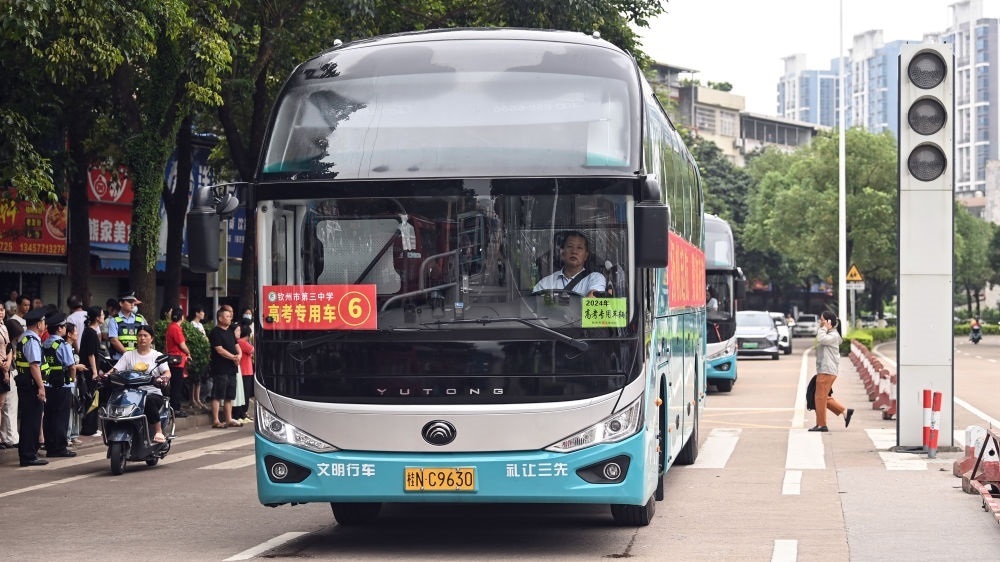 ↑6月7日,在廣西欽州市第二中學(xué)考點(diǎn),高考專(zhuān)用車(chē)接送考生應(yīng)考。