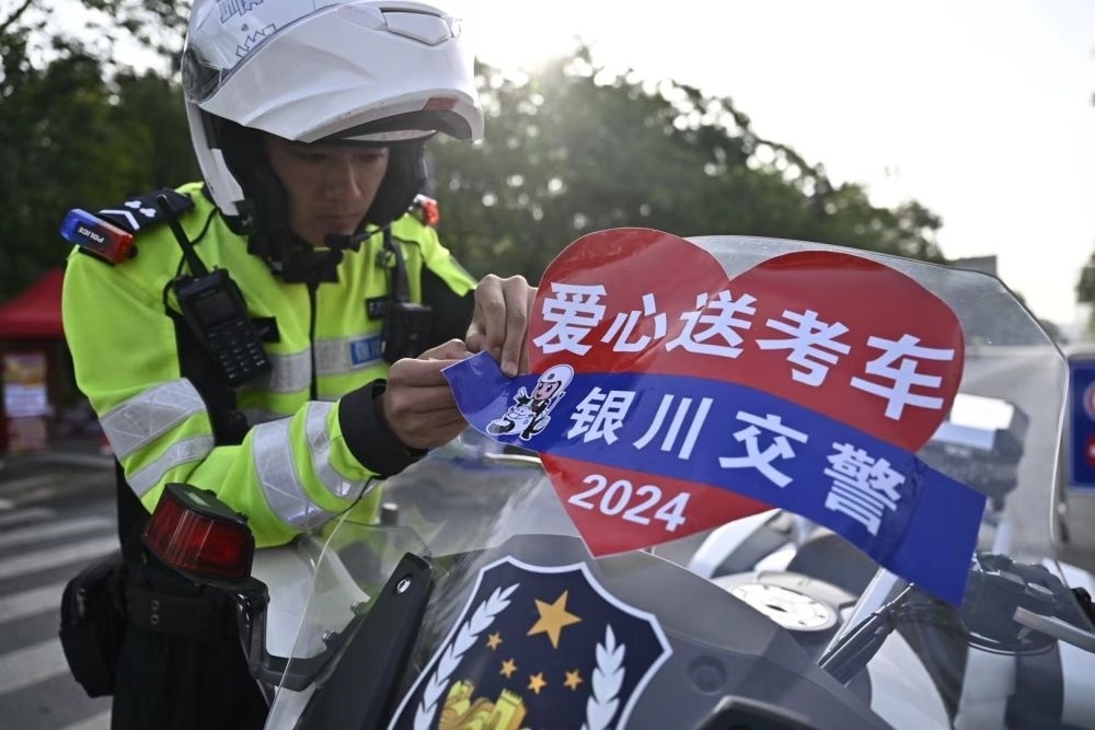 ↑6月7日,寧夏銀川市公安局交通警察分局興慶區(qū)交警一大隊(duì)民警在準(zhǔn)備愛(ài)心送考車(chē)輛。