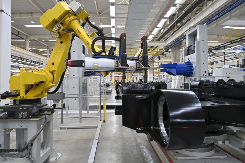 2024年4月9日,在山西太原太重集團(tuán)智能高端液壓挖掘機(jī)產(chǎn)業(yè)園區(qū),智能裝配機(jī)器人在智能生產(chǎn)線(xiàn)上作業(yè)。