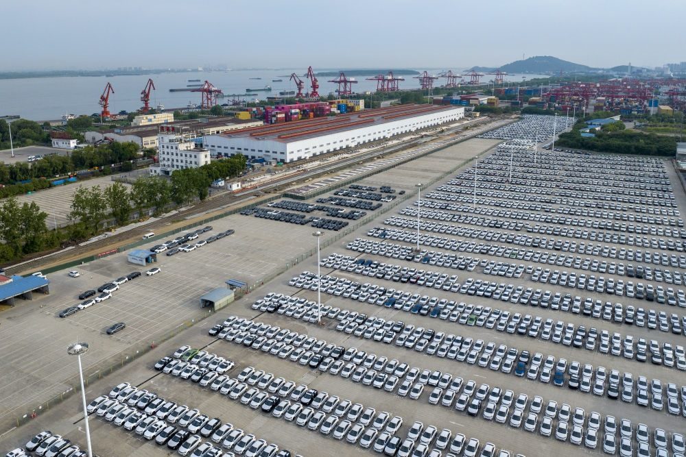 2024年5月26日,在安徽蕪湖港朱家橋港區(qū)國(guó)際集裝箱碼頭,整齊排列的汽車等待出口(無(wú)人機(jī)照片)。作為安徽省首個(gè)國(guó)家一類開放口岸,蕪湖港現(xiàn)已發(fā)展成為長(zhǎng)三角城市群綜合交通運(yùn)輸體系的重要樞紐。