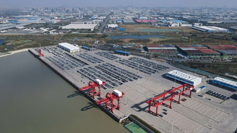這是2022年10月11日拍攝的安徽合肥派河國(guó)際綜合物流園港區(qū)碼頭(無(wú)人機(jī)照片)。依托連通長(zhǎng)江與淮河的江淮運(yùn)河,2023年7月,占地6000多畝的合肥生產(chǎn)服務(wù)型國(guó)家物流樞紐獲批。以派河港為圓心,半徑5公里范圍內(nèi)布局了3個(gè)整車基地;半徑10公里范圍內(nèi),覆蓋了合肥七成的先進(jìn)制造業(yè)企業(yè),工業(yè)總產(chǎn)值超7000億元。