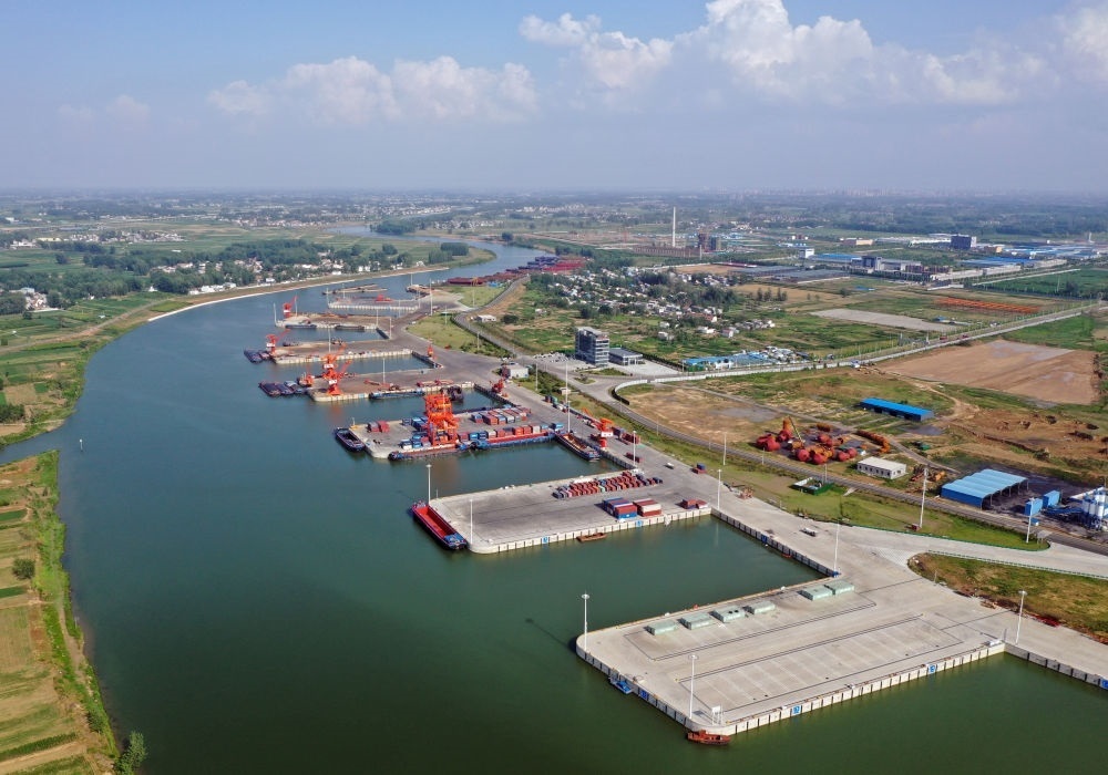 2022年6月28日拍攝的河南周口中心港碼頭(無(wú)人機(jī)照片)。近年來(lái),河南積極推進(jìn)沙潁河航道升級(jí)改造,疏通內(nèi)河航運(yùn)。現(xiàn)在,從周口中心港出發(fā)的船舶可經(jīng)沙潁河至淮河、京杭大運(yùn)河駛?cè)腴L(zhǎng)江,讓內(nèi)陸城市亦能通江達(dá)海。