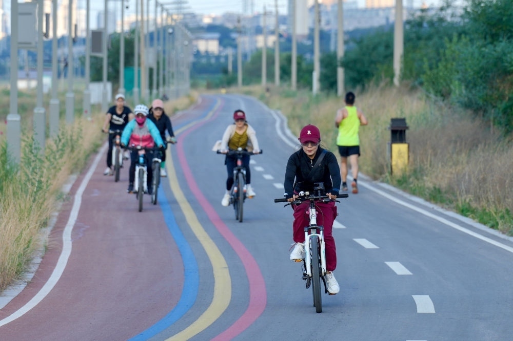 2024年6月5日,人們在運城鹽湖環(huán)湖步道上騎行。