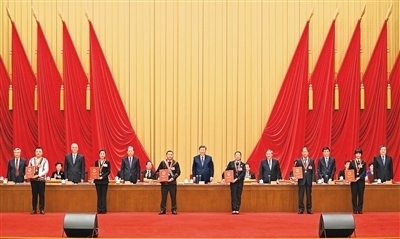 在歡快的樂(lè)曲聲中,習(xí)近平等為受表彰的模范個(gè)人和模范集體代表頒獎(jiǎng)。