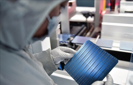 青海黃河上游水電開(kāi)發(fā)有限責(zé)任公司西寧太陽(yáng)能電力分公司車(chē)間,一名工作人員在檢查光伏組件(2023年2月22日攝)吳剛攝/本刊