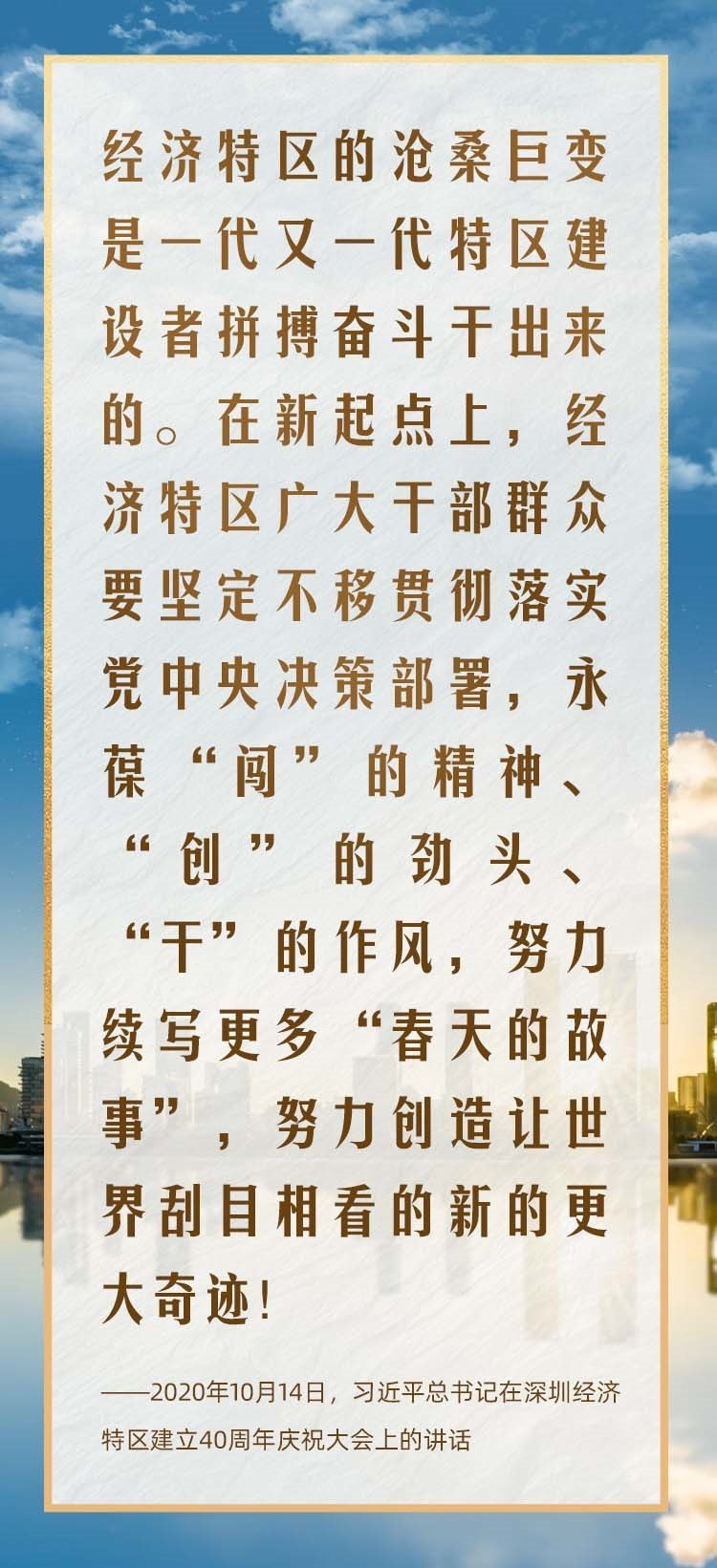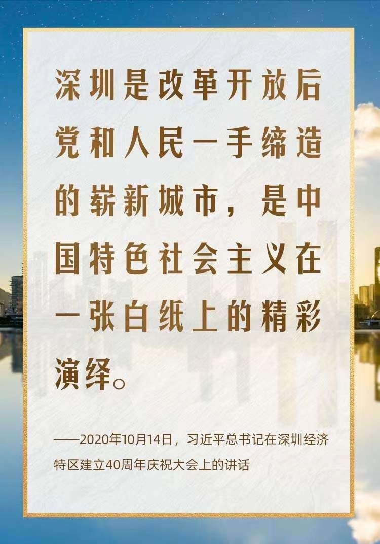 2020年10月,在慶祝深圳經(jīng)濟(jì)特區(qū)建立40周年之際,習(xí)近平總書(shū)記又一次來(lái)到這里,出席慶祝大會(huì),強(qiáng)調(diào)改革不停頓、開(kāi)放不止步,在更高起點(diǎn)上推進(jìn)改革開(kāi)放,推動(dòng)經(jīng)濟(jì)特區(qū)工作開(kāi)創(chuàng)新局面。