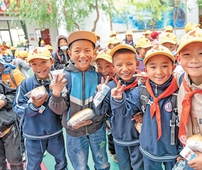 在西藏那曲市班戈縣中石化小學,學生手拿營養(yǎng)餐等待放學。新華社記者 丁增尼達攝