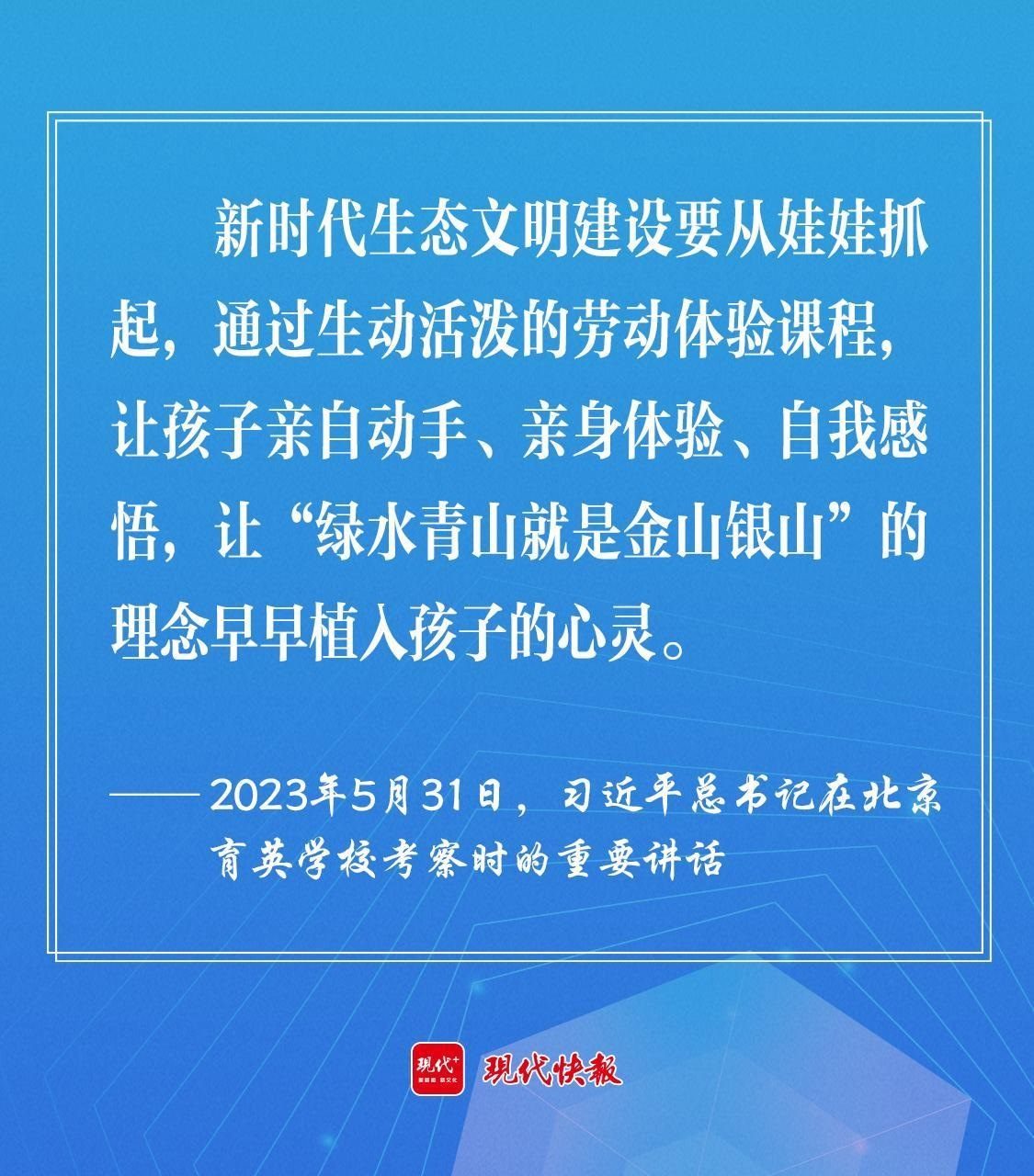 2023年5月,習(xí)近平總書(shū)記在北京育英學(xué)??疾鞎r(shí)強(qiáng)調(diào),新時(shí)代生態(tài)文明建設(shè)要從娃娃抓起,通過(guò)生動(dòng)活潑的勞動(dòng)體驗(yàn)課程,讓孩子親自動(dòng)手、親身體驗(yàn)、自我感悟,讓“綠水青山就是金山銀山”的理念早早植入孩子的心靈。