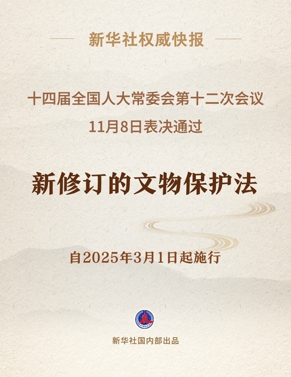 十四屆全國(guó)人大常委會(huì)第十二次會(huì)議11月8日表決通過(guò)新修訂的文物保護(hù)法,自2025年3月1日起施行。