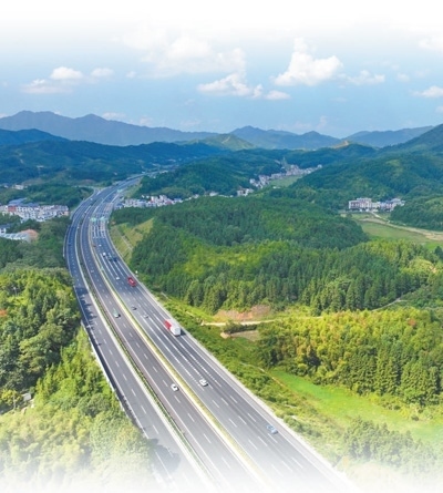 江西省吉安市遂川縣巾石鄉(xiāng)湯村村,車輛在泰贛高速公路上疾馳,綠樹群山與鄉(xiāng)村農(nóng)房相映成景。朱海鵬攝(人民視覺)