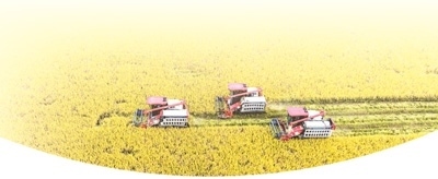 湖南省永州市東安縣蘆洪市鎮(zhèn)西江橋村優(yōu)質(zhì)稻產(chǎn)業(yè)化示范生產(chǎn)基地,專業(yè)收割機(jī)正在收割晚稻。蔡小平攝(人民視覺)