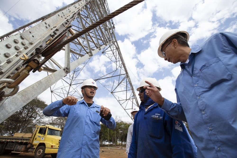 2018年8月7日,在巴西東南部米納斯吉拉斯州阿科斯市附近,巴西美麗山特高壓輸電工程二期第九標段項目中方現(xiàn)場施工管理負責人(左)在施工現(xiàn)場指導巴方員工。美麗山水電站二期項目是中國國家電網(wǎng)公司首個在海外獨立投資、建設和運營的特高壓直流輸電工程,也是“特高壓+清潔能源”在拉美的示范工程。