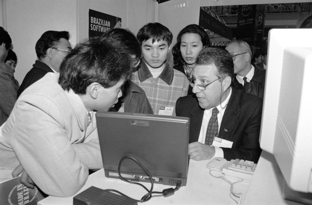 1995年12月14日,巴西外貿及合資項目洽談會在上海舉行。這是一位參展商向參觀者介紹巴西電腦網(wǎng)絡系統(tǒng)軟件設備。