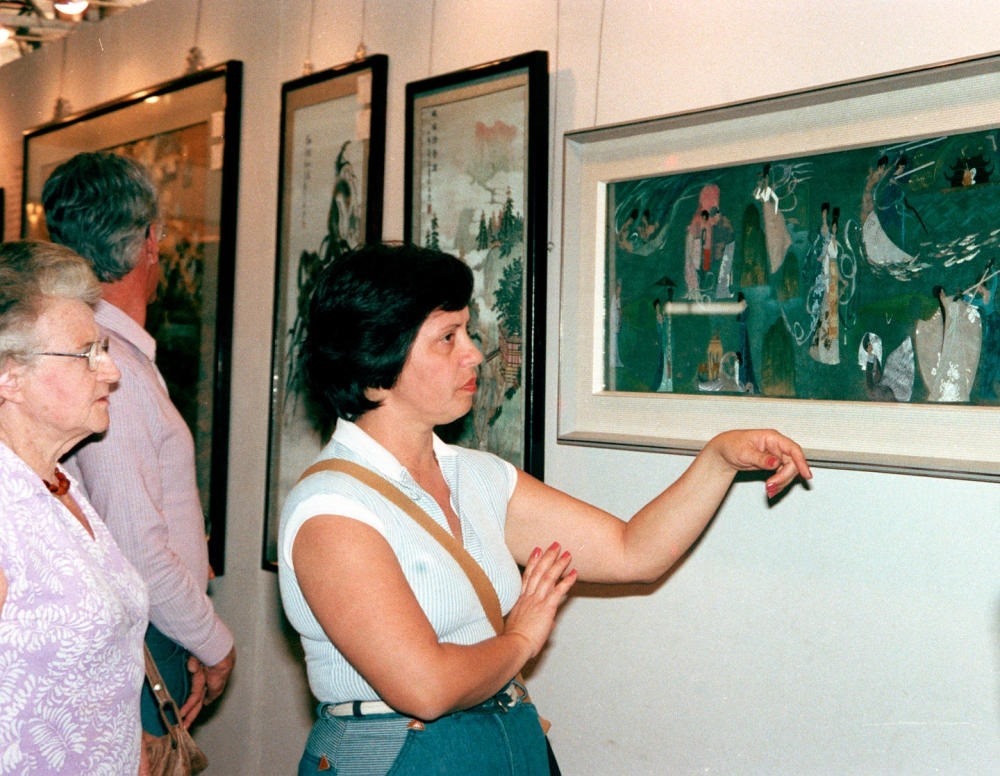 1983年5月24日至7月31日,中國經(jīng)濟貿易展覽會在巴西圣保羅和里約熱內盧舉辦。這是巴西觀眾在展覽會上欣賞貝雕羽毛畫。