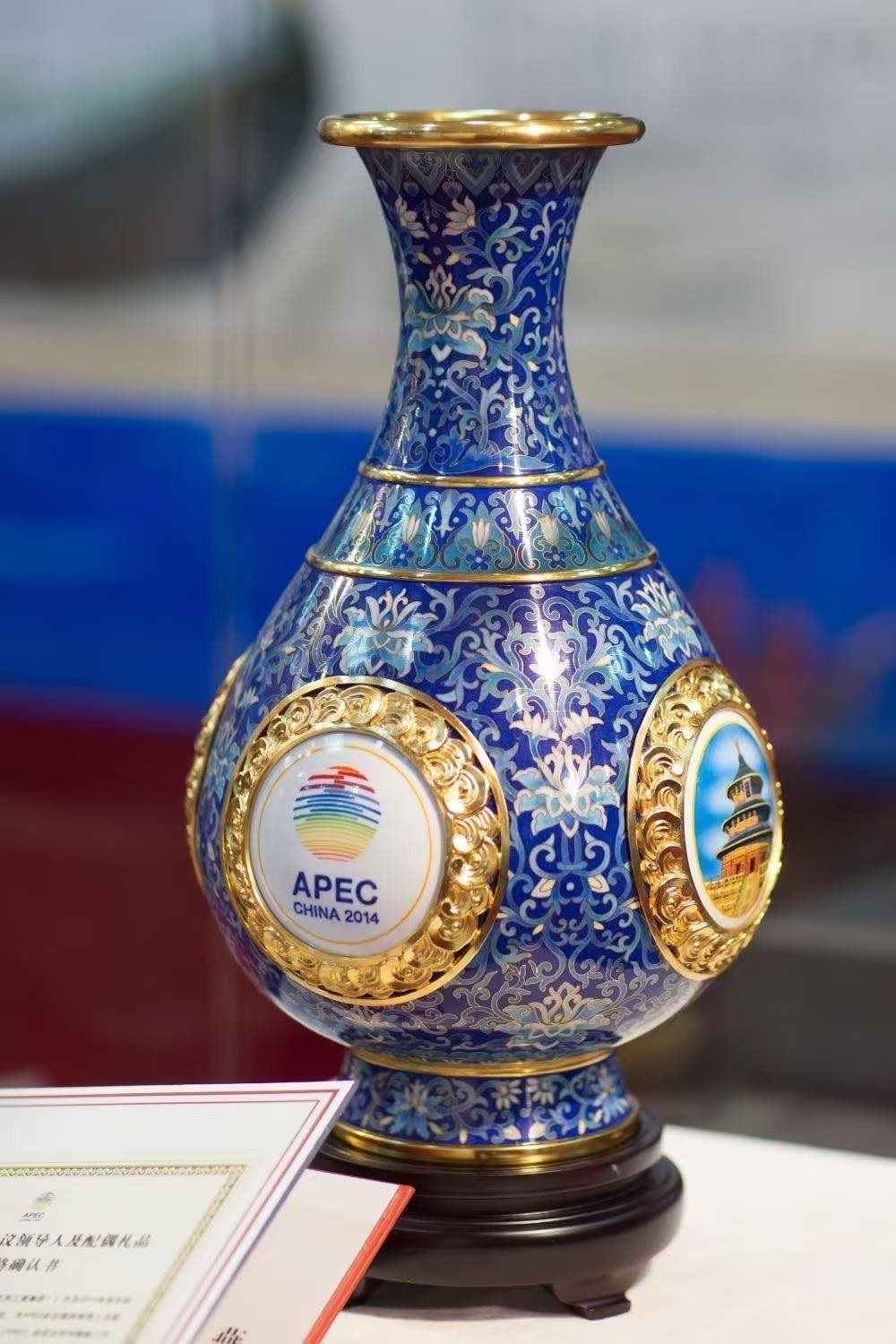 2014年11月,北京APEC會議在雁棲湖畔舉行。為歡迎參會的各經(jīng)濟(jì)體領(lǐng)導(dǎo)人,習(xí)近平主席選定了一件國禮——“四海升平”景泰藍(lán)賞瓶。賞瓶的細(xì)節(jié)蘊含巧思:瓶高38厘米,是天壇祈年殿38米的等比例縮小;最大直徑21厘米,代表APEC的21個經(jīng)濟(jì)體。碧藍(lán)的瓶身雕著水紋,既象征“四海”也代表環(huán)太平洋。“瓶”是“平”的諧音,連起來即“四海升平”。