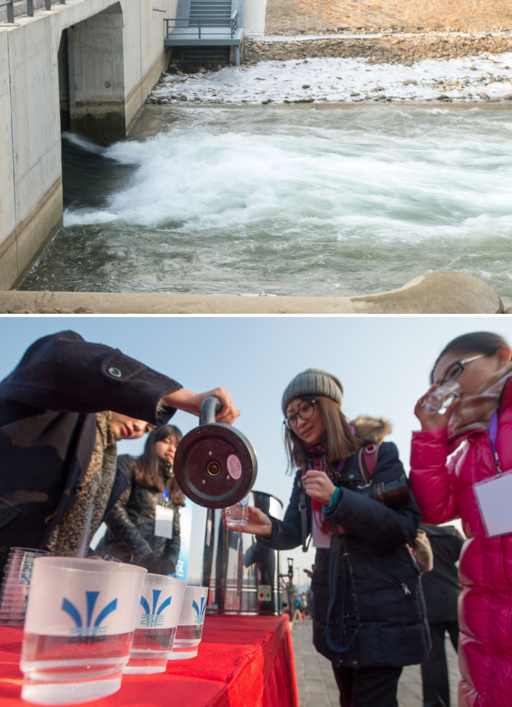 2014年12月27日,南水北調(diào)中線一期工程總干渠終點(diǎn)團(tuán)城湖明渠開閘放水(上圖);參加通水儀式的嘉賓在北京品嘗了來自丹江口的水(下圖,拼版照片)。