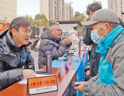 寶山區(qū)新顧城大居拓展區(qū)聯(lián)合黨支部開(kāi)展便民服務(wù)活動(dòng)。圖為工作人員為居民提供法律咨詢。
