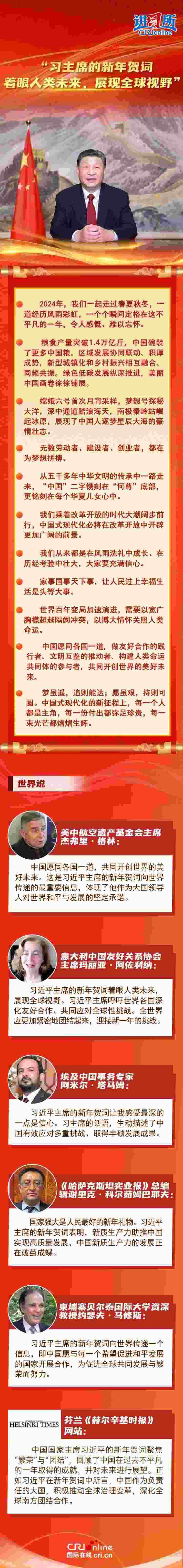 多國人士認為,習近平主席的新年賀詞著眼人類未來,展現(xiàn)全球視野,體現(xiàn)了作為大國領導人對世界和平與發(fā)展的堅定承諾。