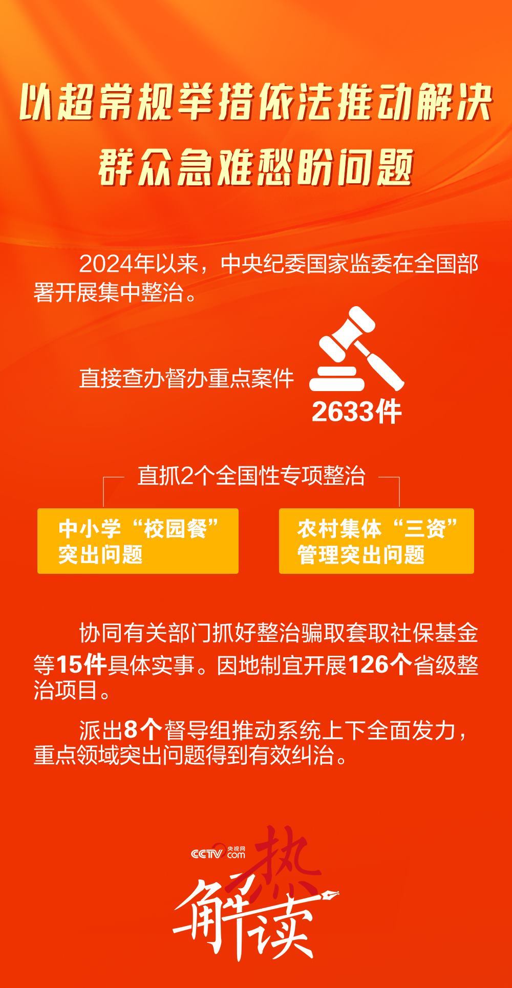 以“校園餐”問(wèn)題為例。2024年,中央紀(jì)委國(guó)家監(jiān)委督促有關(guān)部門首次摸清全國(guó)中小學(xué)食堂及供餐情況等底數(shù),指導(dǎo)各級(jí)監(jiān)察機(jī)關(guān)依法查處貪占學(xué)生餐費(fèi)、插手招標(biāo)采購(gòu)、收受回扣等問(wèn)題3.8萬(wàn)件,處分2.3萬(wàn)人。在斬?cái)嗌煜颉靶@餐”的“黑手”的同時(shí),補(bǔ)上了監(jiān)管制度的漏洞。中央紀(jì)委國(guó)家監(jiān)委會(huì)同教育部、市場(chǎng)監(jiān)管總局、財(cái)政部等單位,制定“校園餐”管理監(jiān)督指導(dǎo)意見,推動(dòng)完善膳食經(jīng)費(fèi)管理等制度,確保每一筆資金來(lái)源與去向都在陽(yáng)光下透明運(yùn)作。