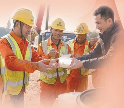 浙江省湖州市長興縣泗安鎮(zhèn)東村村干部為高速改擴(kuò)建項目施工人員送餃子。