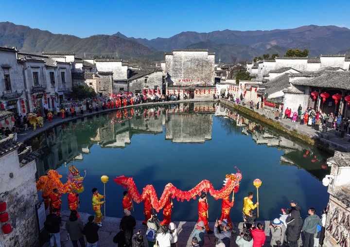 2025年1月18日,民俗表演隊在安徽省黃山市黟縣宏村巡游(無人機照片)。新華社發(fā)(施亞磊 攝)