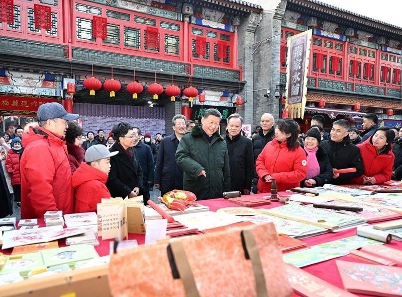 2024年春節(jié)前夕,總書記來到天津古文化街。在泥人張店鋪,他仔細觀看手藝人修復(fù)“孔子撫琴”的泥塑,感慨道:“一代代接續(xù)的工匠精神,讓文脈得以綿延不息。”在街邊的楊柳青木版年畫店鋪,他端詳“勾、刻、印、繪、裱”道道工藝,贊賞道“連年有余,寄托了人們對美好生活的向往”。