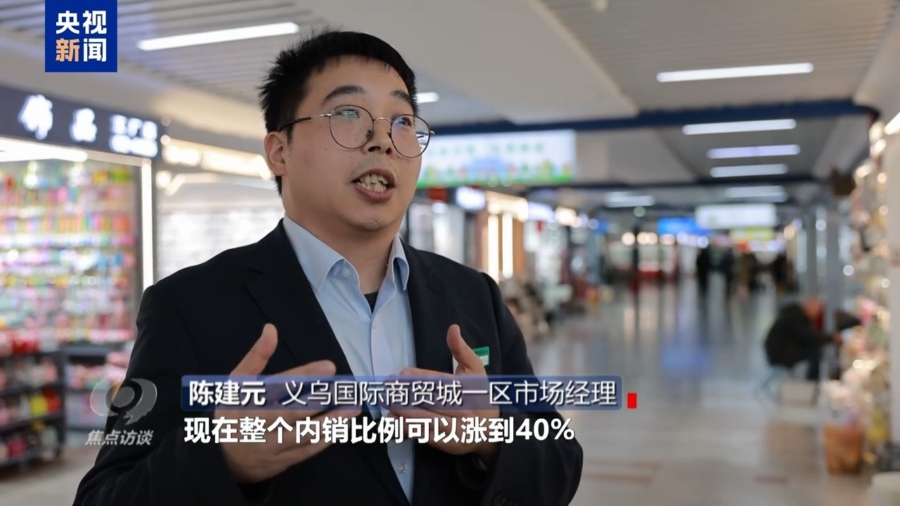 義烏國(guó)際商貿(mào)城一區(qū)市場(chǎng)經(jīng)理 陳建元:我們有一個(gè)統(tǒng)計(jì),拿我們的飾品行業(yè)來(lái)說(shuō),經(jīng)過這幾年培育,直播電商的快速發(fā)展,有些經(jīng)營(yíng)戶轉(zhuǎn)型,現(xiàn)在整個(gè)內(nèi)銷比例可以漲到40%,比例還是有一個(gè)很明顯的提升。