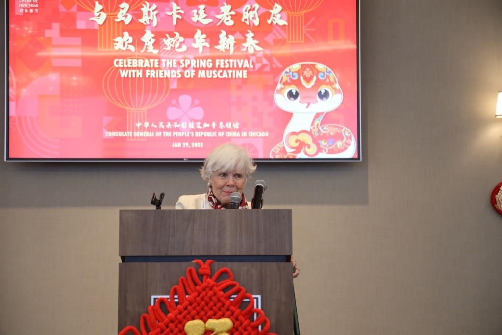 美國艾奧瓦州小城馬斯卡廷,當(dāng)?shù)貢r間農(nóng)歷蛇年初一。明媚陽光照耀下,在梅里爾酒店六層,一場特別的新春聚會正在舉行。福字、窗花、中國結(jié),“中國紅”裝點著喜慶祥和的氛圍。中美友人歡聚一堂,沉浸在歡聲笑語中。