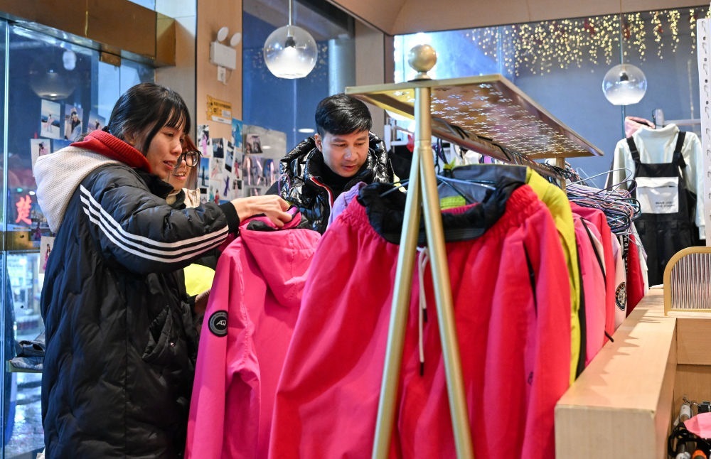 2025年1月23日,游客在湖北神農(nóng)架林區(qū)木魚(yú)鎮(zhèn)街邊一家店鋪挑選雪具雪服。自然天成的地理環(huán)境造就豐富的冰雪資源,也給當(dāng)?shù)剡\(yùn)動(dòng)裝備銷(xiāo)售、租賃行業(yè)帶來(lái)了商機(jī)。