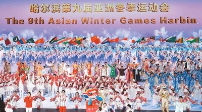 二月七日,第九屆亞洲冬季運(yùn)動會開幕式在黑龍江省哈爾濱市舉行。圖為演員在開幕式上表演。