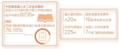 據(jù)全國人大常委會代表工委負責人介紹,十四屆全國人大二次會議期間,全國人大代表依法履職盡責,對各方面工作提出建議、批評和意見9235件,交由213家承辦單位研究辦理,其中,重點督辦建議共20項。