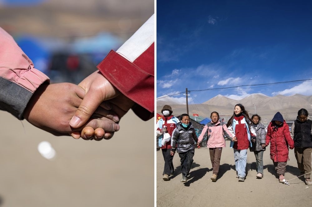 在西藏日喀則市定日縣長所鄉(xiāng)森嘎村,西部計劃志愿者周漣笛和地震災區(qū)孩子們在一起,幫助他們疏導心理(拼版照片,2025年1月13日攝)。新年伊始,一場突如其來的地震打破了高原的寧靜。眾多志愿服務力量緊急奔赴,為受災群眾帶來溫暖和力量。