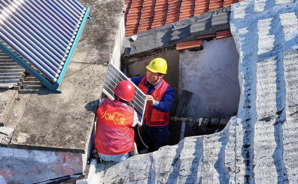 2025年3月2日,浙江余姚大城小愛公益服務中心志愿者在一老舊小區(qū)開展太陽能照明公益改造,照亮老社區(qū)居民的回家路(無人機照片)。