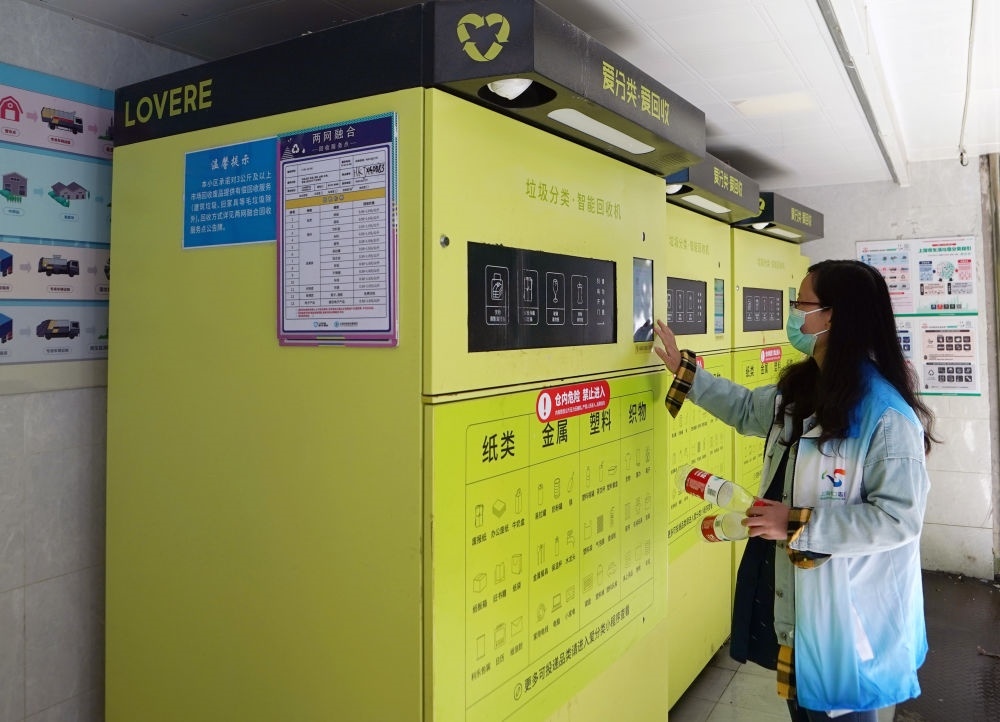 2023年5月23日,志愿者在上海市虹口區(qū)嘉興路街道愛家豪庭小區(qū)演示垃圾分類智能回收機的使用方法。