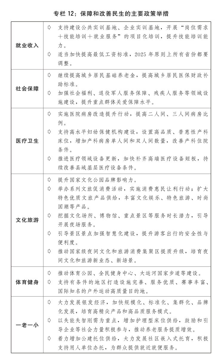 一是實(shí)施提振消費(fèi)專(zhuān)項(xiàng)行動(dòng)。制定提升消費(fèi)能力、增加優(yōu)質(zhì)供給、改善消費(fèi)環(huán)境政策舉措,穩(wěn)定大宗消費(fèi)、擴(kuò)大服務(wù)消費(fèi)、拓展新型消費(fèi)、合理增加公共消費(fèi),推動(dòng)消費(fèi)提質(zhì)升級(jí)。多渠道促進(jìn)居民增收,推動(dòng)中低收入群體增收減負(fù),完善勞動(dòng)者工資正常增長(zhǎng)機(jī)制。因城施策調(diào)減房地產(chǎn)消費(fèi)限制性措施,推動(dòng)建設(shè)安全、舒適、綠色、智慧的“好房子”,更好滿足人民群眾剛性和改善性住房需求、高品質(zhì)居住需要。進(jìn)一步優(yōu)化汽車(chē)限購(gòu)管理政策,加快構(gòu)建充電基礎(chǔ)設(shè)施體系,開(kāi)展汽車(chē)流通消費(fèi)改革試點(diǎn)。加快拓展文化、旅游、體育、健康、養(yǎng)老、托幼、家政、數(shù)字等服務(wù)消費(fèi),實(shí)施服務(wù)消費(fèi)提質(zhì)惠民活動(dòng)、“百城百區(qū)”文化和旅游消費(fèi)行動(dòng)計(jì)劃。加快培育帶動(dòng)性廣、顯示度高的消費(fèi)新場(chǎng)景,支持影視游戲創(chuàng)作與中華優(yōu)秀傳統(tǒng)文化、特色旅游資源相結(jié)合等融合式沉浸式消費(fèi)新場(chǎng)景發(fā)展。積極發(fā)展首發(fā)經(jīng)濟(jì)、冰雪經(jīng)濟(jì)、銀發(fā)經(jīng)濟(jì)。完善游艇、房車(chē)露營(yíng)等新型消費(fèi)領(lǐng)域管理機(jī)制和行業(yè)標(biāo)準(zhǔn),促進(jìn)“人工智能+消費(fèi)”,優(yōu)化消費(fèi)新業(yè)態(tài)新領(lǐng)域市場(chǎng)準(zhǔn)入環(huán)境,加快推動(dòng)各類(lèi)新技術(shù)應(yīng)用推廣并向消費(fèi)級(jí)產(chǎn)品轉(zhuǎn)化。清理對(duì)消費(fèi)的不合理限制。深入實(shí)施優(yōu)化消費(fèi)環(huán)境三年行動(dòng),加強(qiáng)消費(fèi)信用體系和質(zhì)量標(biāo)準(zhǔn)體系建設(shè),規(guī)范網(wǎng)絡(luò)銷(xiāo)售、直播帶貨領(lǐng)域不合理經(jīng)營(yíng)行為,強(qiáng)化消費(fèi)者權(quán)益保護(hù)。落實(shí)和優(yōu)化帶薪年休假制度。完善外國(guó)人入境居留政策和免稅店政策,推動(dòng)擴(kuò)大入境消費(fèi)。深化國(guó)際消費(fèi)中心城市建設(shè)。