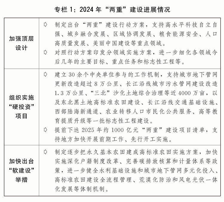 二是發(fā)行超長(zhǎng)期特別國(guó)債支持“兩重”建設(shè)取得積極進(jìn)展。著眼于系統(tǒng)解決強(qiáng)國(guó)建設(shè)、民族復(fù)興進(jìn)程中一些重大項(xiàng)目建設(shè)的資金問(wèn)題,從2024年起發(fā)行超長(zhǎng)期特別國(guó)債支持國(guó)家重大戰(zhàn)略和重點(diǎn)領(lǐng)域安全能力建設(shè)。堅(jiān)持自上而下、軟硬結(jié)合,建立實(shí)施項(xiàng)目?jī)?chǔ)備、集中聯(lián)審、專(zhuān)款專(zhuān)用、強(qiáng)化監(jiān)督等全鏈條推進(jìn)保障機(jī)制?!坝餐顿Y”方面,嚴(yán)格做好項(xiàng)目篩選,2024年安排7000億元超長(zhǎng)期特別國(guó)債支持1465個(gè)重大項(xiàng)目建設(shè),項(xiàng)目基本全部開(kāi)工、全年完成投資超過(guò)1.2萬(wàn)億元。“軟建設(shè)”方面,堅(jiān)持項(xiàng)目建設(shè)和配套改革相結(jié)合,扎實(shí)推進(jìn)規(guī)劃編制、政策制定和體制機(jī)制改革創(chuàng)新,不斷完善投入機(jī)制、提高投入效率。規(guī)范項(xiàng)目全過(guò)程管理方面,出臺(tái)“兩重”建設(shè)有關(guān)管理辦法,督促項(xiàng)目加快開(kāi)工建設(shè),嚴(yán)格資金監(jiān)管,加強(qiáng)監(jiān)測(cè)調(diào)度和現(xiàn)場(chǎng)監(jiān)督檢查,確保建成優(yōu)質(zhì)工程、精品工程、放心工程。