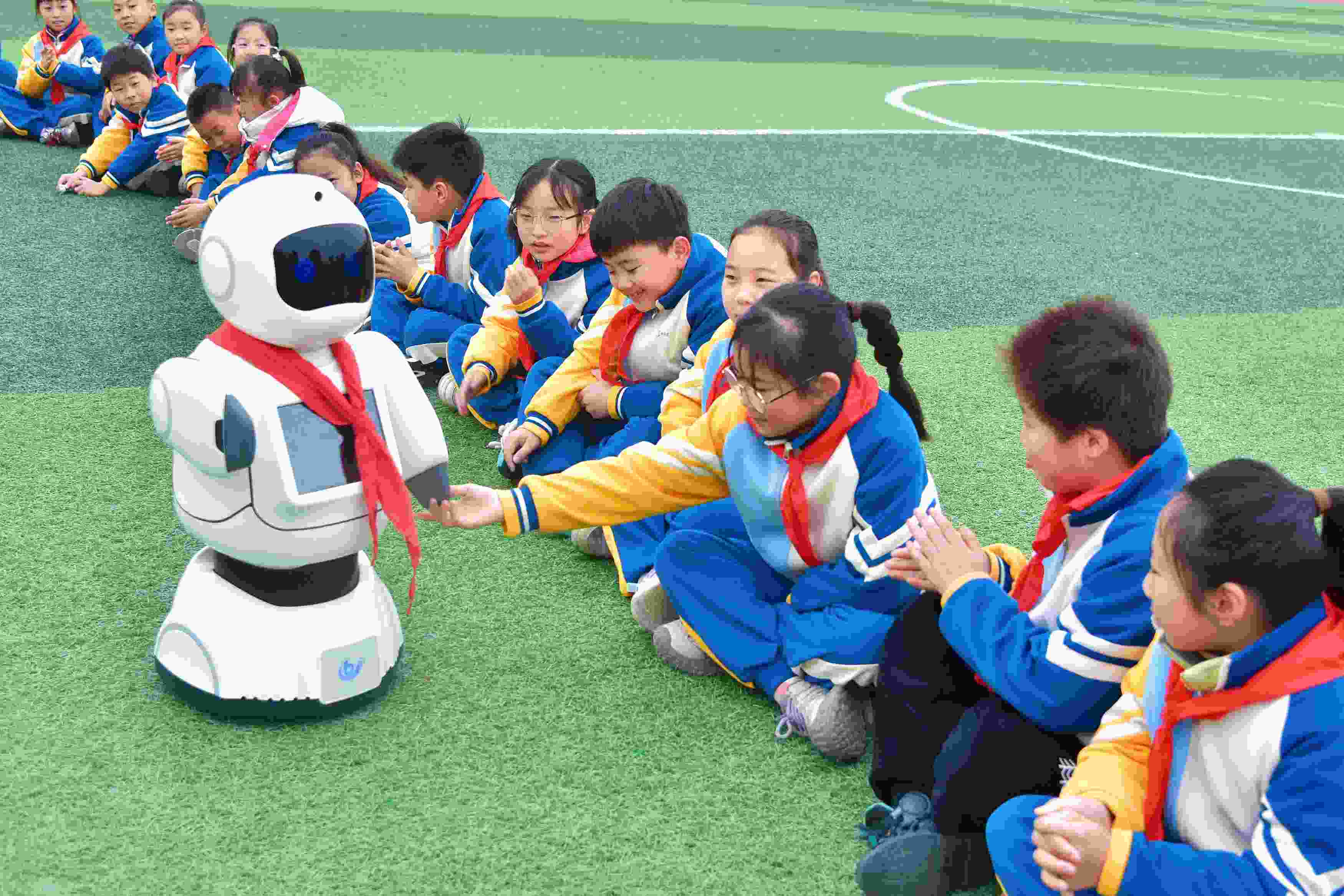 △2025年3月10日,江蘇南通,如皋經(jīng)濟(jì)技術(shù)開(kāi)發(fā)區(qū)實(shí)驗(yàn)小學(xué)課間,學(xué)生與智能機(jī)器人“賓果”互動(dòng)。