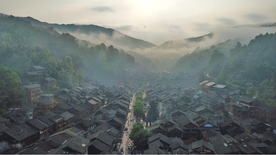 肇興侗寨內(nèi),古樸別致的吊腳樓掩映在青山綠水間。