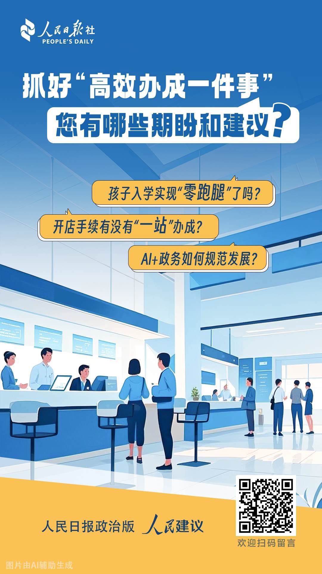 “高效辦成一件事”作為惠企利民的重要政策,如何落實更有效,讓企業(yè)群眾辦事更便利?人工智能又將為政務(wù)服務(wù)帶來哪些新場景?圍繞上述問題,人民日報政治版將聯(lián)合人民網(wǎng)“人民建議”,面向廣大網(wǎng)友開展有獎?wù)骷顒?strong>(點擊留言)。