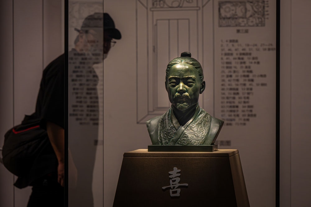 2024年4月30日,游客在湖北省博物館觀看云夢(mèng)睡虎地秦簡(jiǎn)主人“喜”的3D復(fù)原頭像。 當(dāng)日,湖北省博物館策劃的專題展覽“惠此簡(jiǎn)書——睡虎地秦墓出土簡(jiǎn)牘”開(kāi)幕,首次展出科技考古研究成果——“喜”的3D復(fù)原頭像。