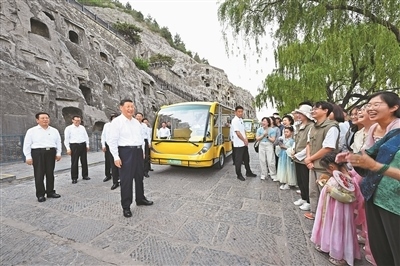 已有1500多年歷史的龍門石窟,是重要的世界文化遺產(chǎn)。習近平來到這里,察看石窟整體布局風貌和代表性窟龕、造像,同現(xiàn)場的文物保護工作者親切交流。他強調(diào),要把這些中華文化瑰寶保護好、傳承好、傳播好。游客們見到總書記,都十分欣喜,紛紛向總書記問好。習近平不時同大家交流,特別鼓勵小朋友們多到實地尋溯中華文化,從小樹立文化自信。他指出,文旅融合前景廣闊,要推動文旅產(chǎn)業(yè)高質(zhì)量發(fā)展,真正打造成為支柱產(chǎn)業(yè)、民生產(chǎn)業(yè)、幸福產(chǎn)業(yè)。