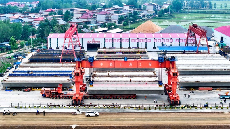 6月21日,在濰宿高鐵中鐵上海局郯城制梁場,提梁機在提運箱梁(無人機照片)。