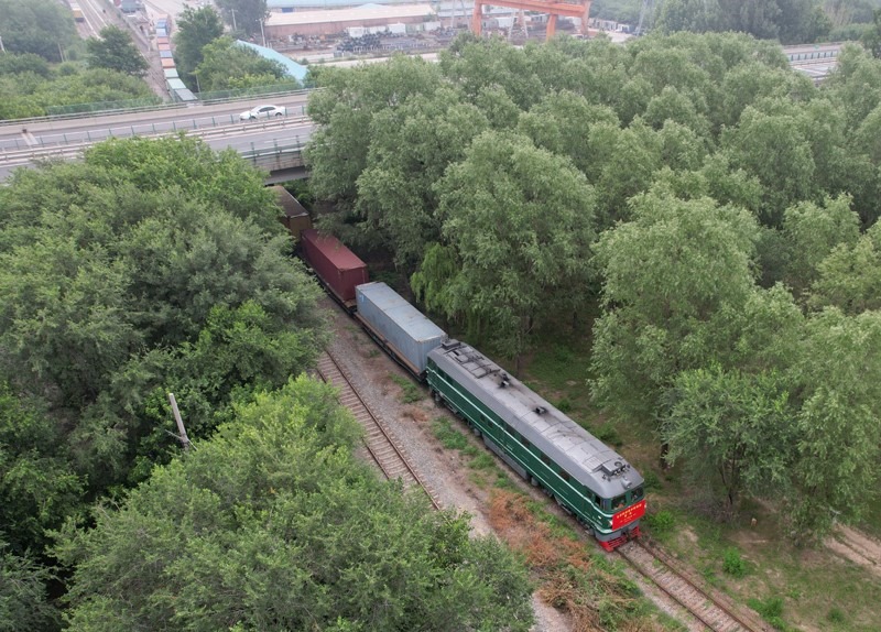 6月30日,北京至阿塞拜疆巴庫的跨里海中歐班列??吭谖挥诒本┦蟹可絽^(qū)的北京國際陸港等待發(fā)車(無人機(jī)照片)。