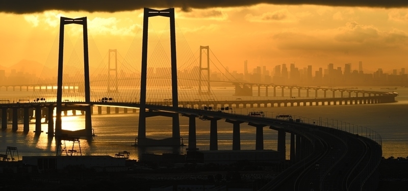 9月14日拍攝的沐浴在晨曦之中的深中通道。